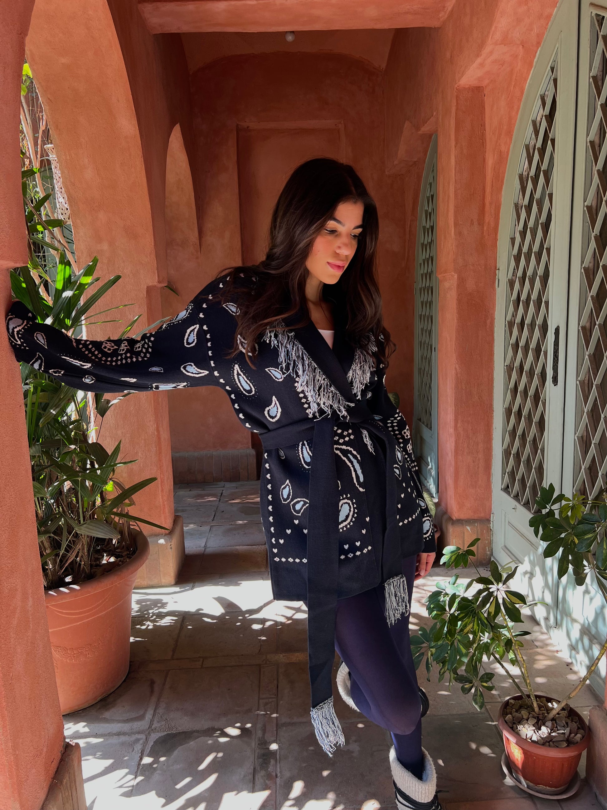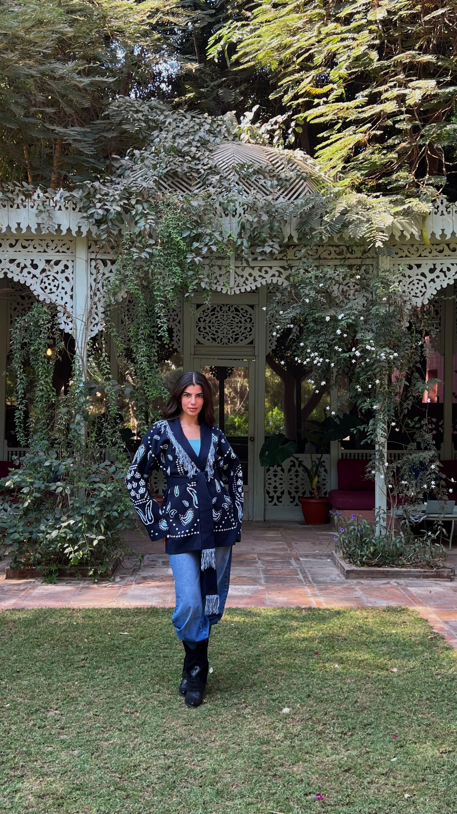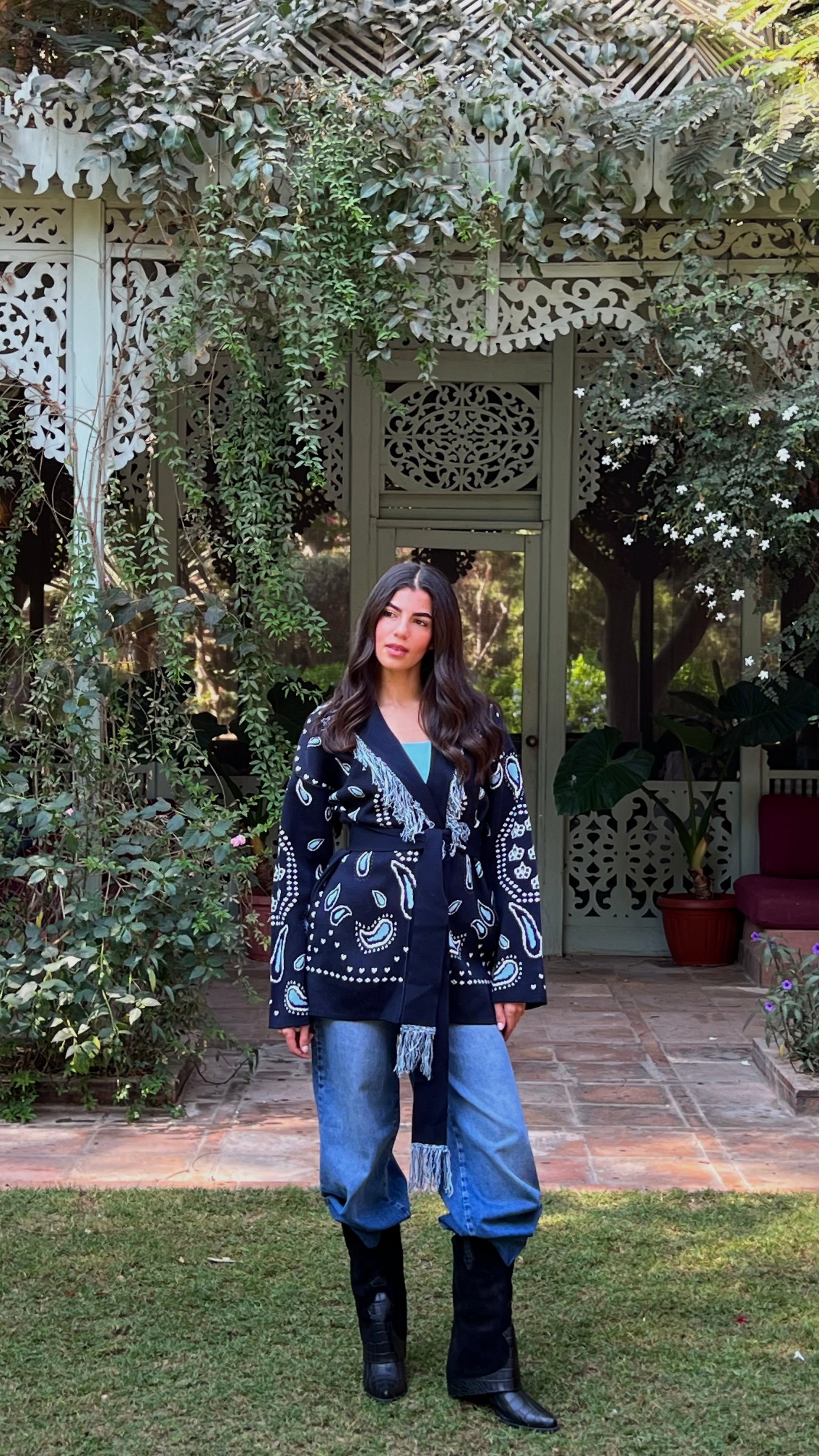 A short navy coat with baby blue patterns that bring a soft winter charm. Stylish, warm, and easy to match with any outfit.