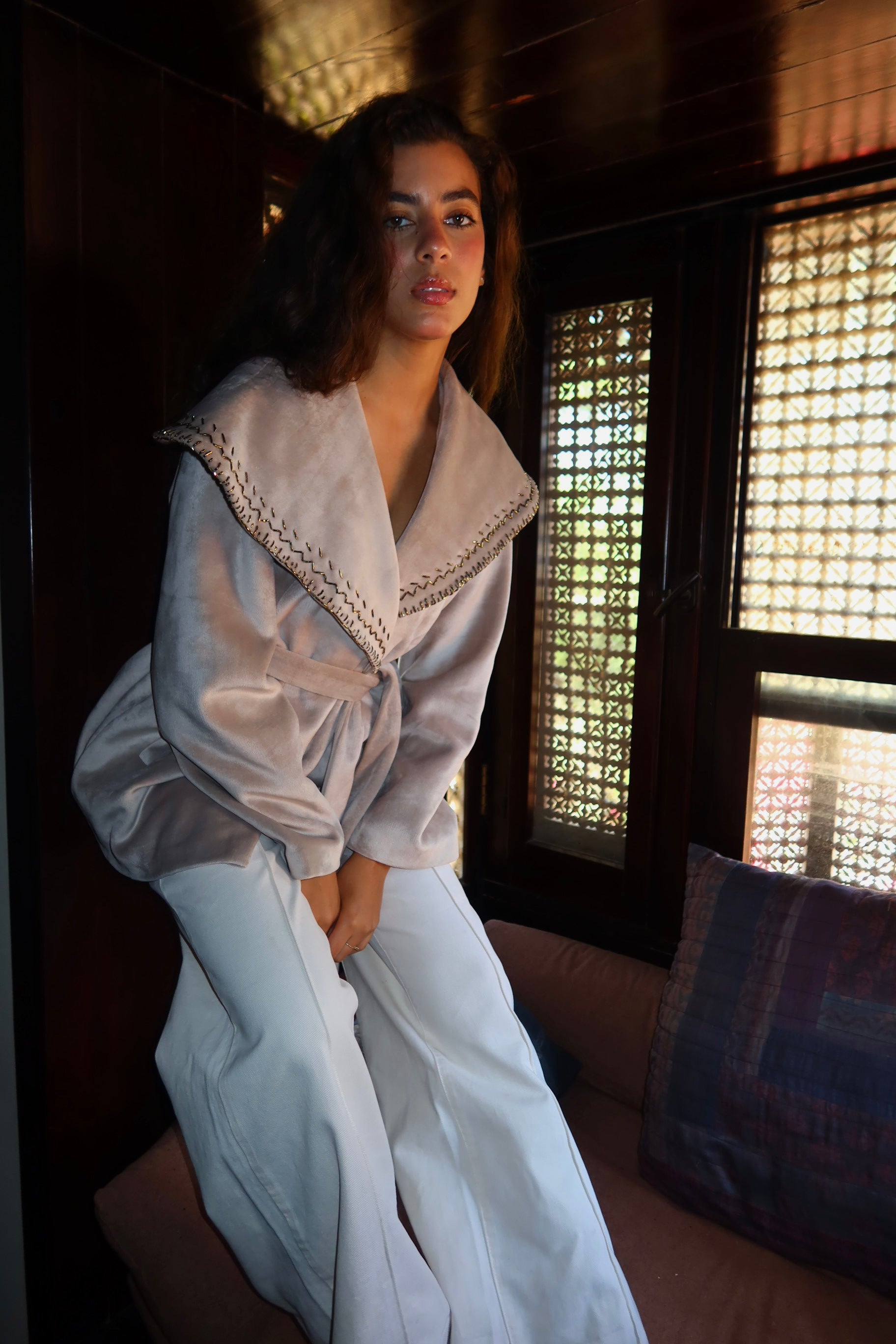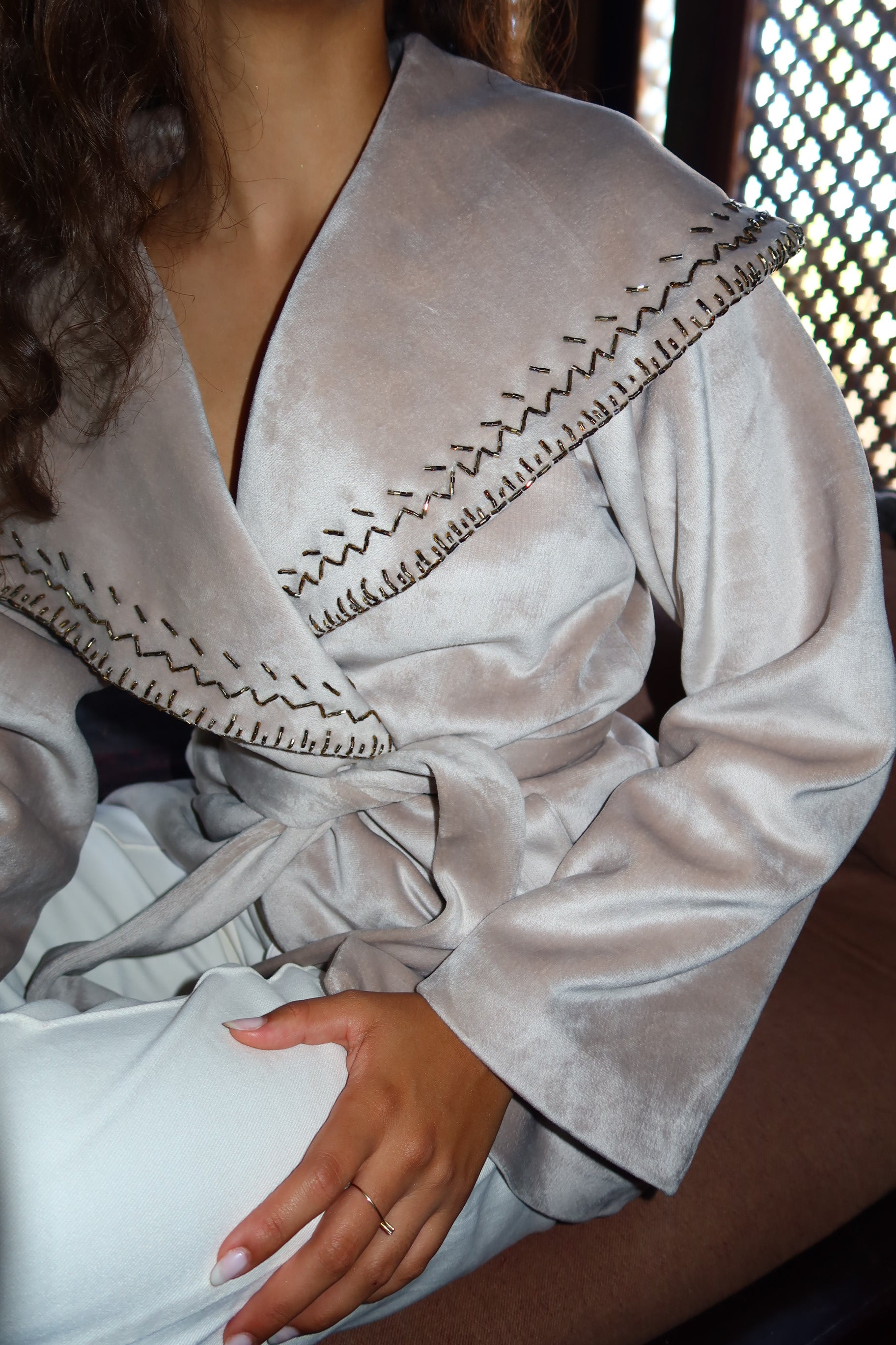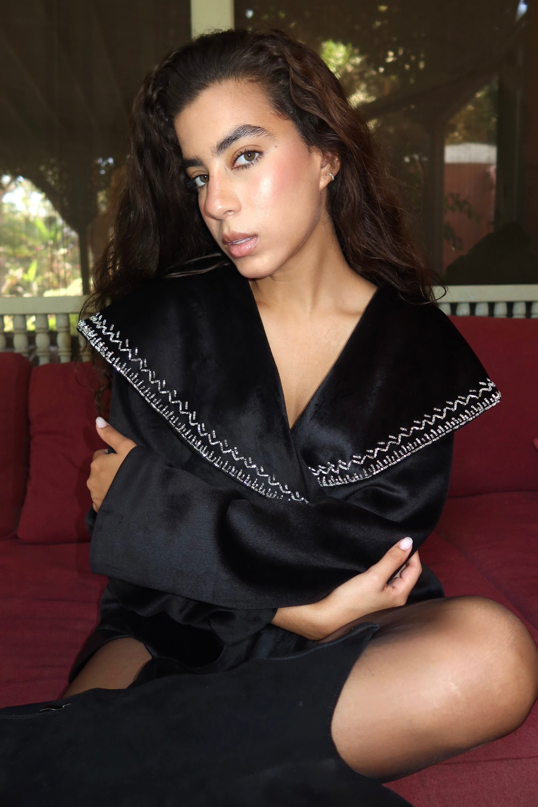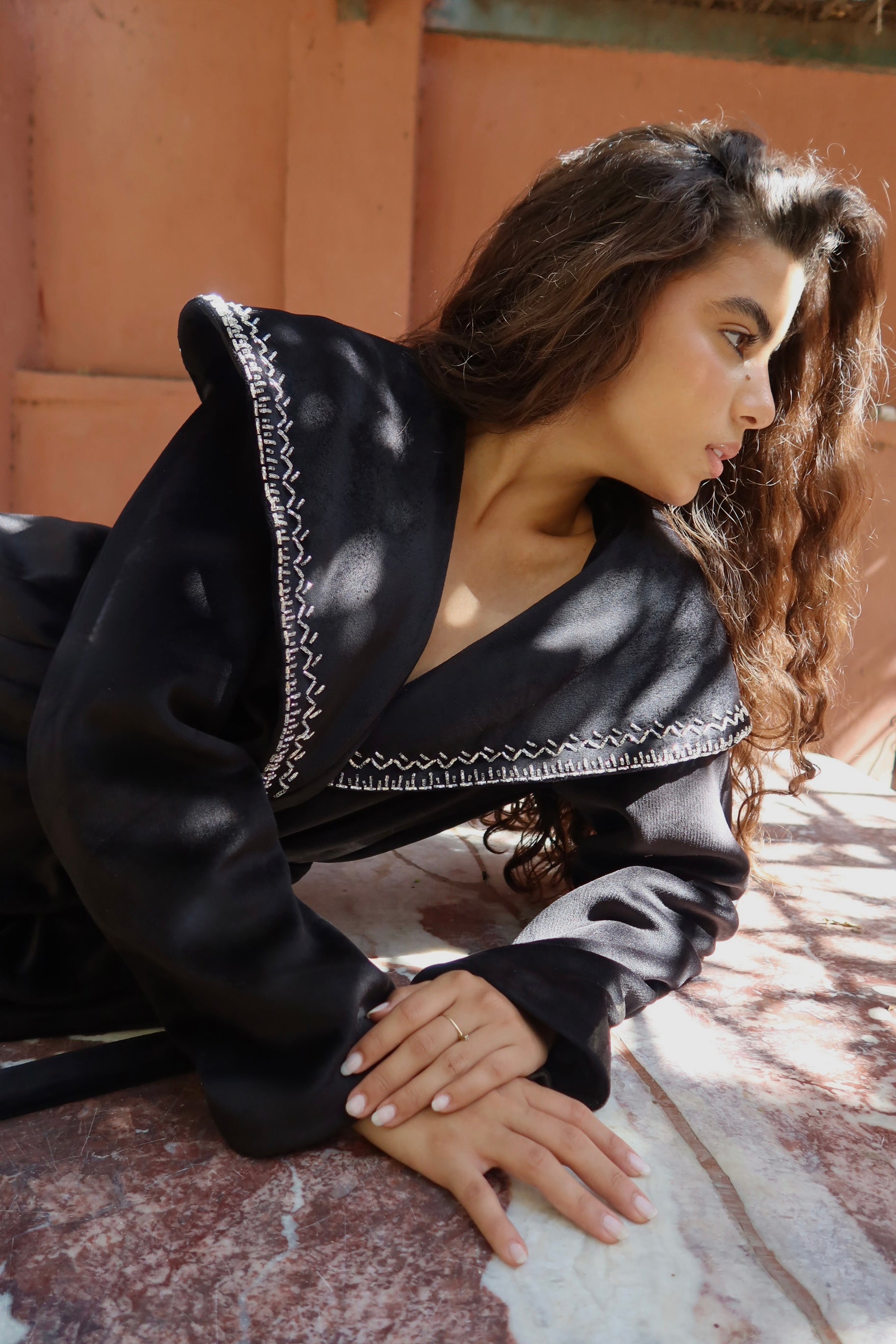 Soft velvet with delicate handmade embroidery on the collar timeless, elegant, and made to stand out.