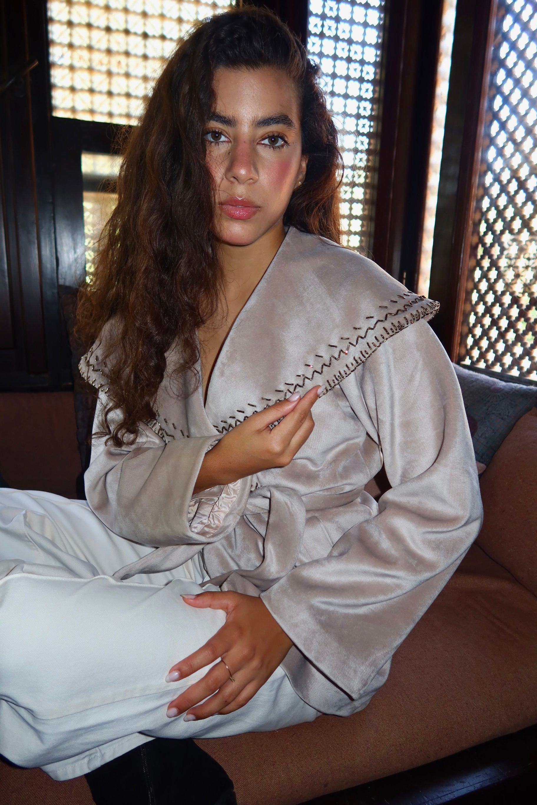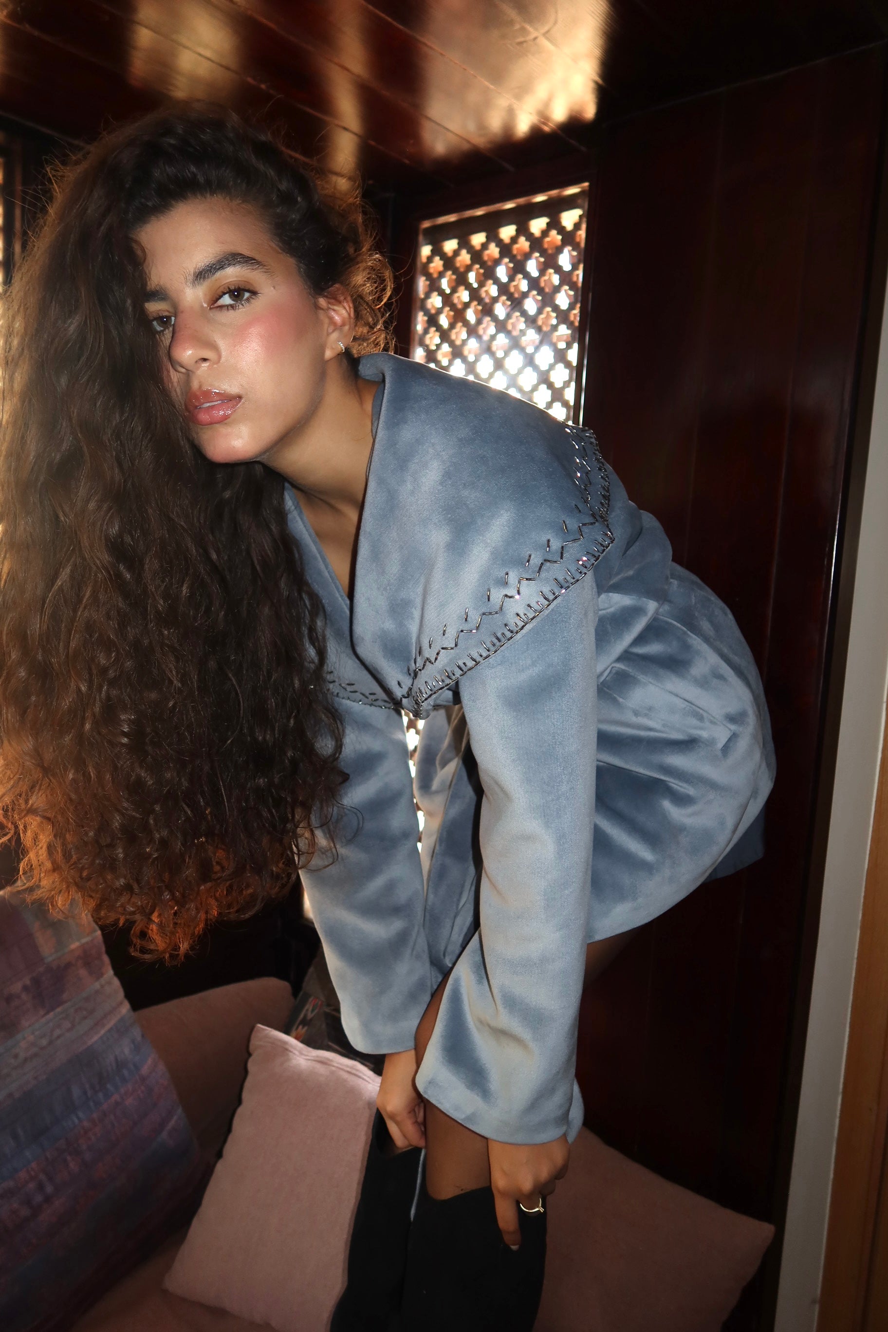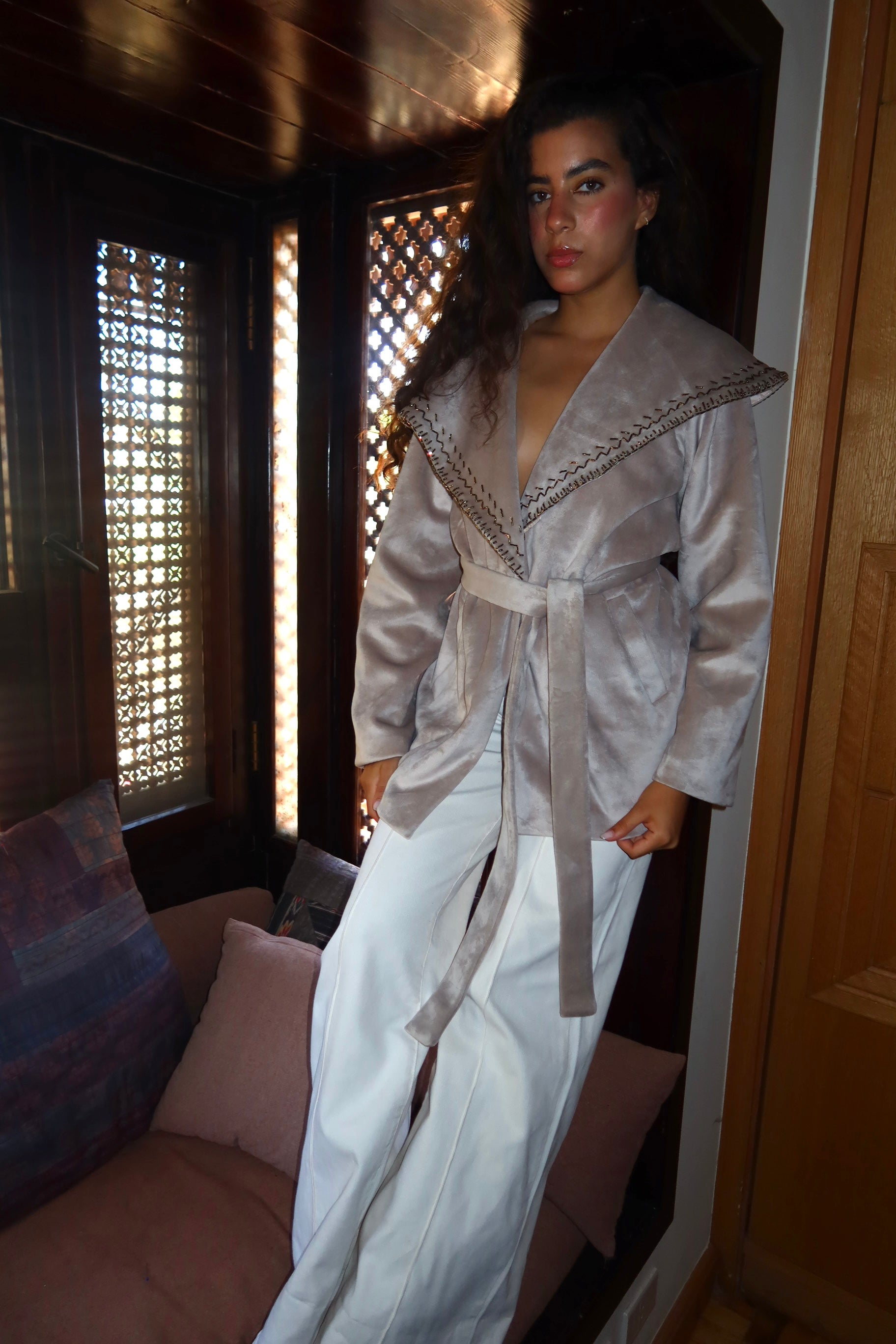 Soft velvet with delicate handmade embroidery on the collar timeless, elegant, and made to stand out.