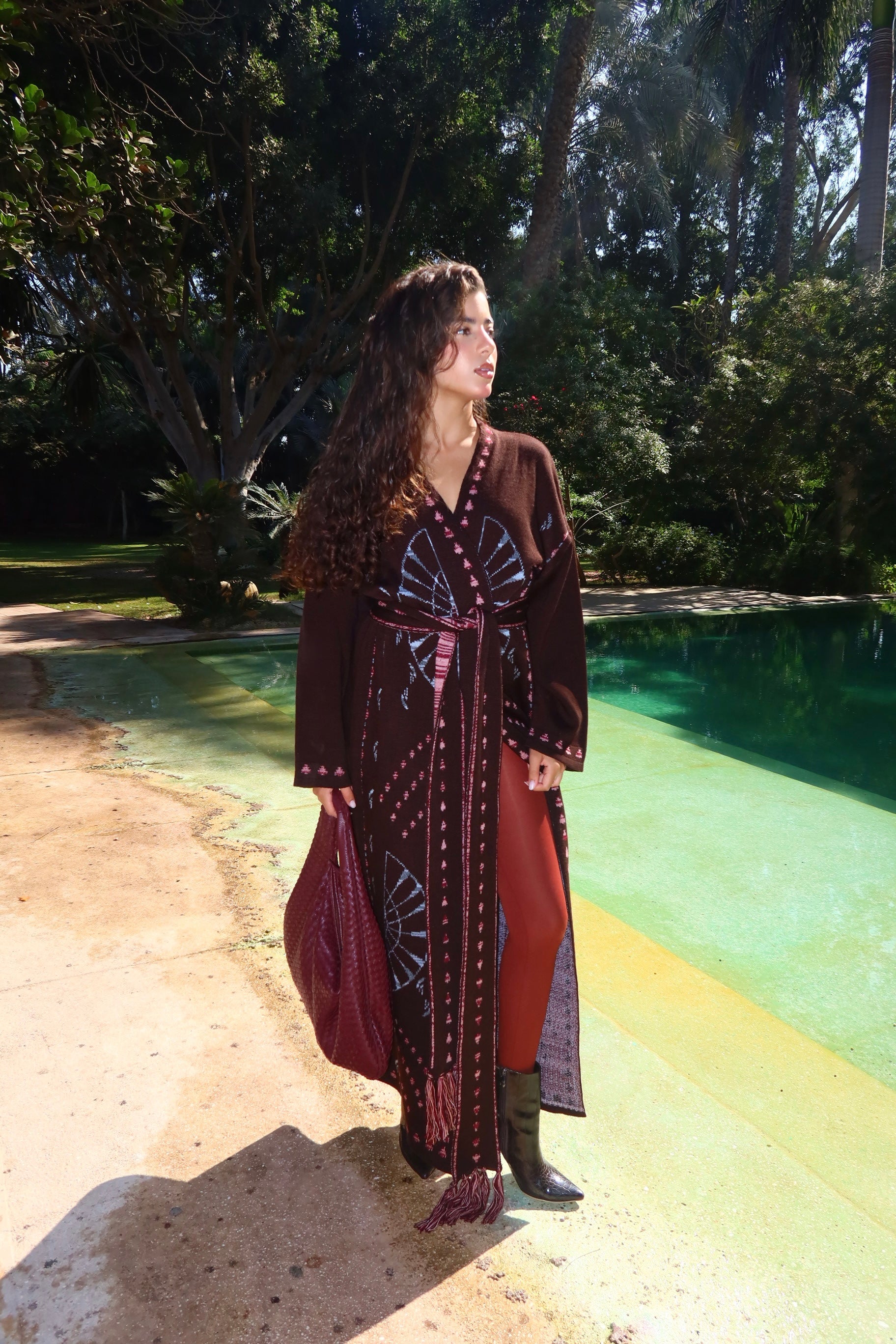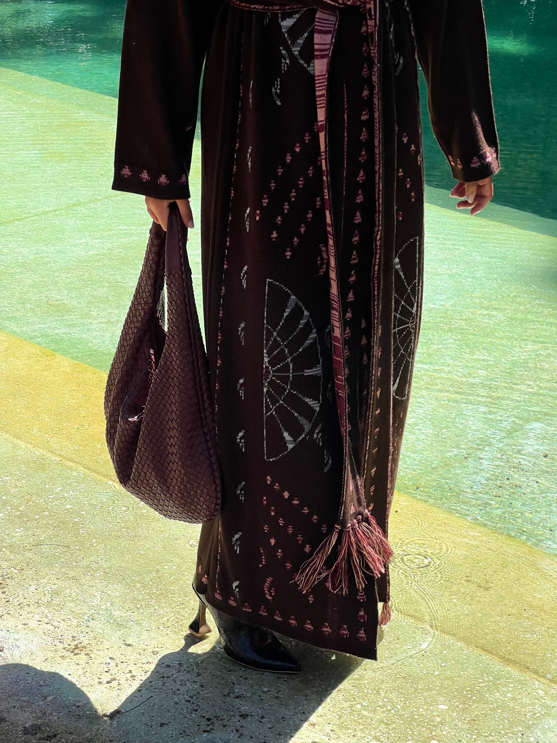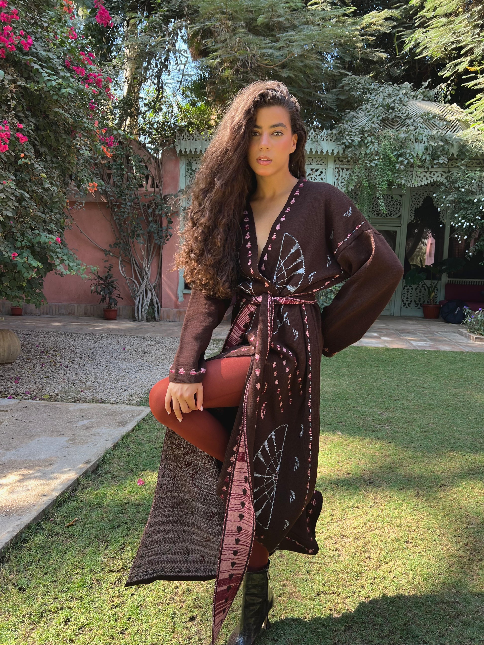 A long, comfy winter coat with soft, subtle patterns perfect for a cozy yet stylish look.