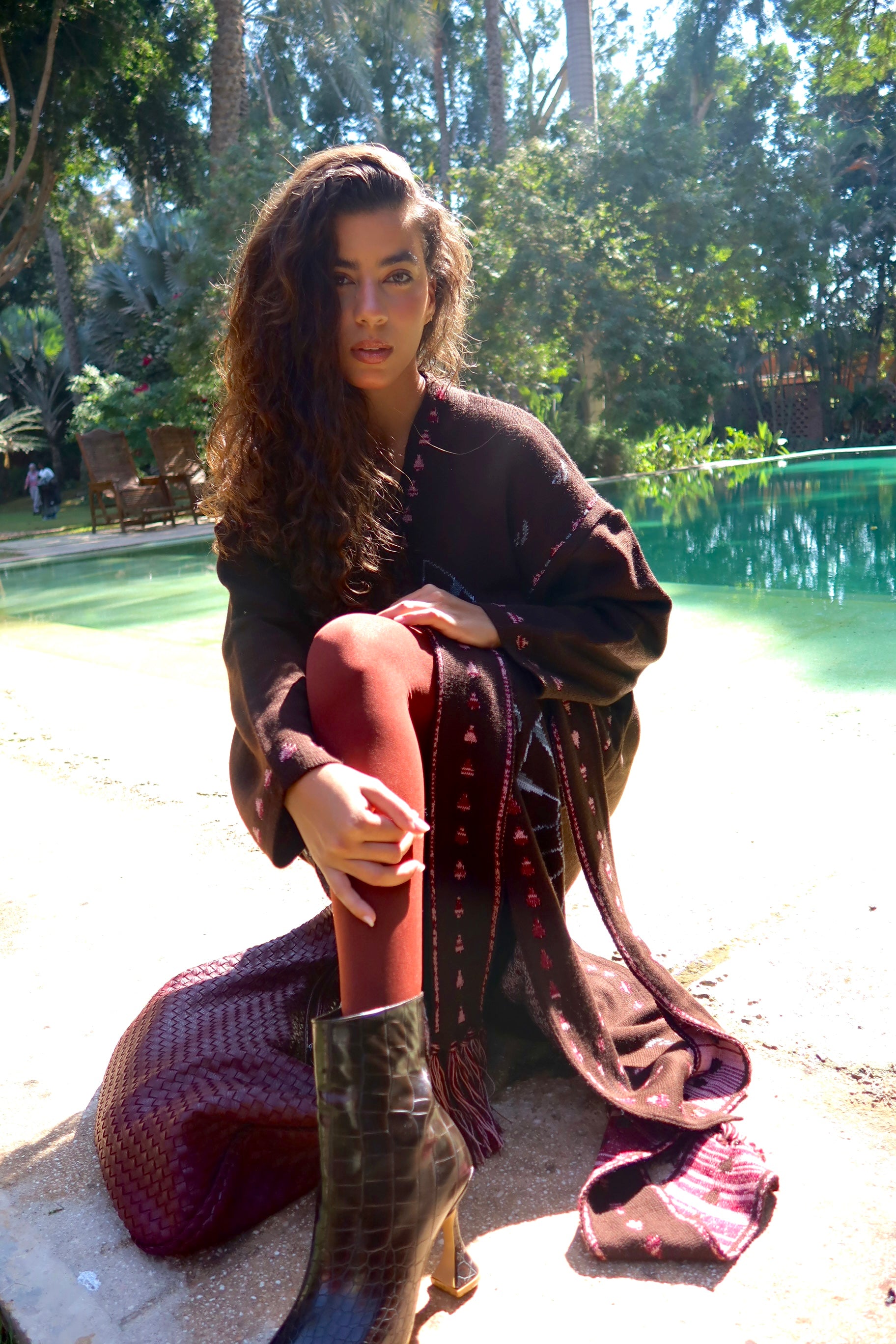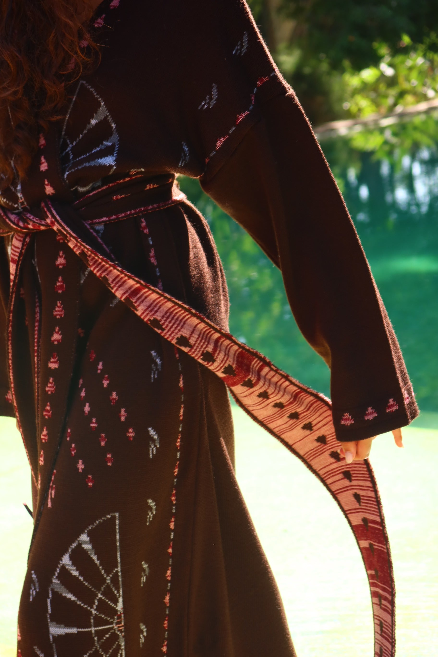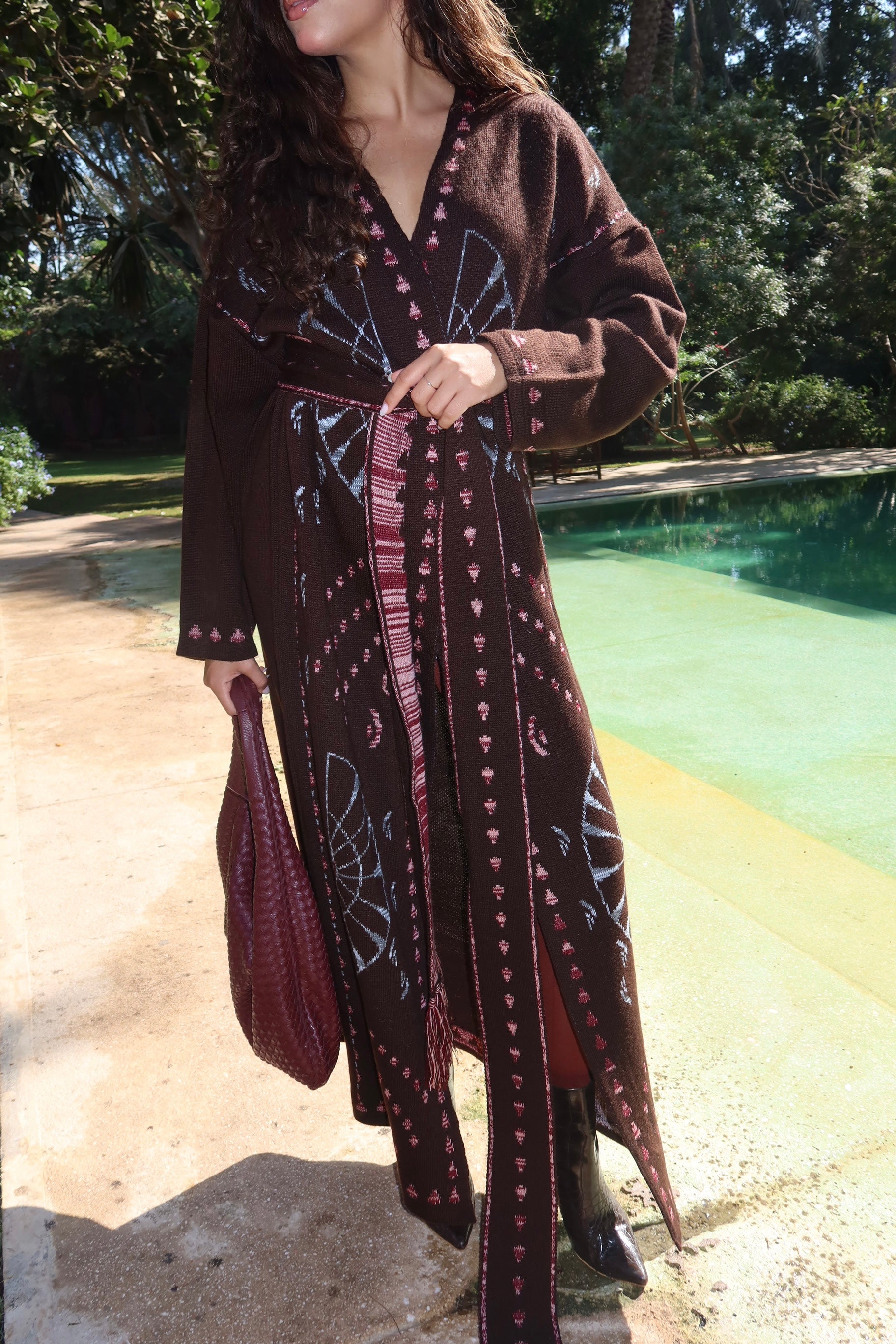 A long, comfy winter coat with soft, subtle patterns perfect for a cozy yet stylish look.